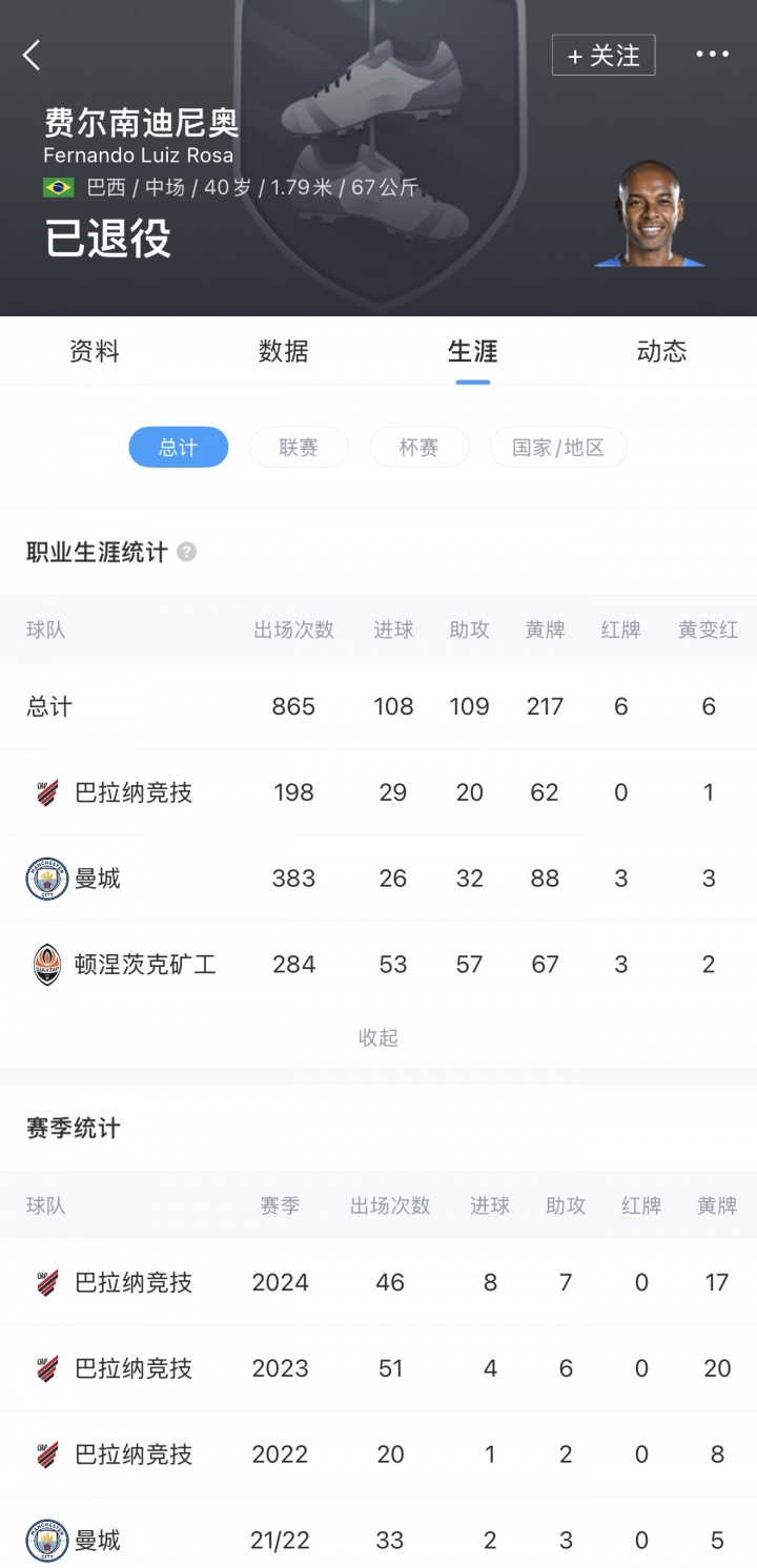 40岁的巴西中场费尔南迪尼奥,生计曾服从于巴拉纳竞技、顿涅茨克矿工、曼城。2013年至2022年服从曼城期间,费尔南迪尼奥共代表球队出战383场比赛,孝顺26球32助,随队夺得包含5次英超在内的13座冠军奖杯。