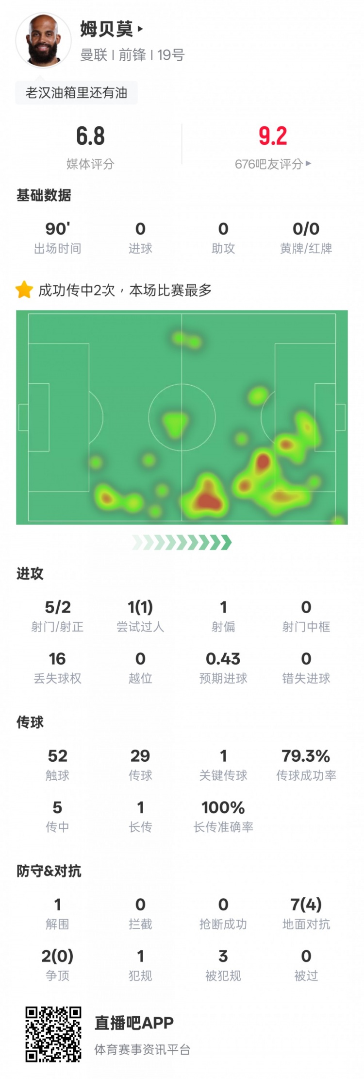 8月18日讯 2025-26赛季英超首轮,曼联主场迎战阿森纳。姆贝莫首发出战,踢满全场,送出1次关节传球,有1次过东说念主告捷,还送出1次突围,但也有16次丢失球权,评分6.8。