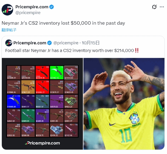 喜爱CS2的巴西球星内马尔也未能避免,据PriceEmpire线路,内马尔原来向上20万好意思元的个东说念主《CS2》饰品库存,仅在往日24小时内就缩水约5万好意思元。