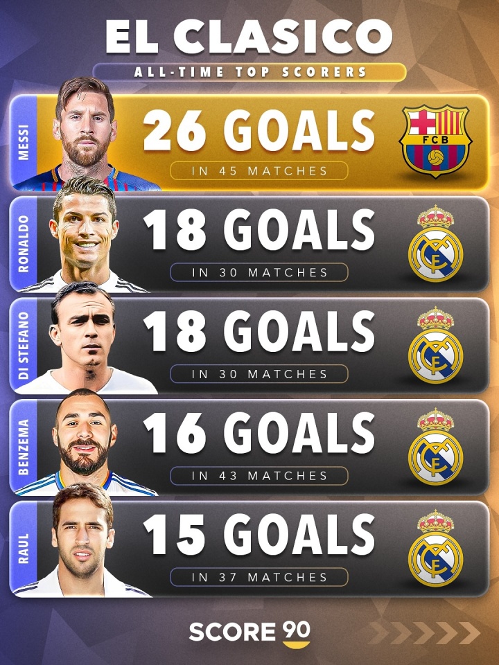 国度德比历史弓手榜,梅西26球遥遥跨越,C罗、迪斯蒂法诺18球比肩第2,本泽马16球,劳尔15球,TOP5仅1名巴萨球员。