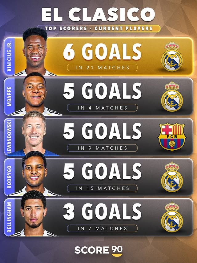 国度德比现役弓手榜,维尼修斯6球居首,姆巴佩、莱万、罗德里戈5球比肩第2,贝林厄姆3球,TOP5相似唯一1名巴萨球员。