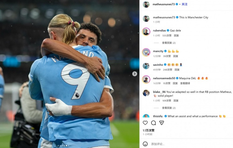 精确制导连线哈兰德!努内斯社媒晒两东说念主相拥庆祝照:这便是曼城!