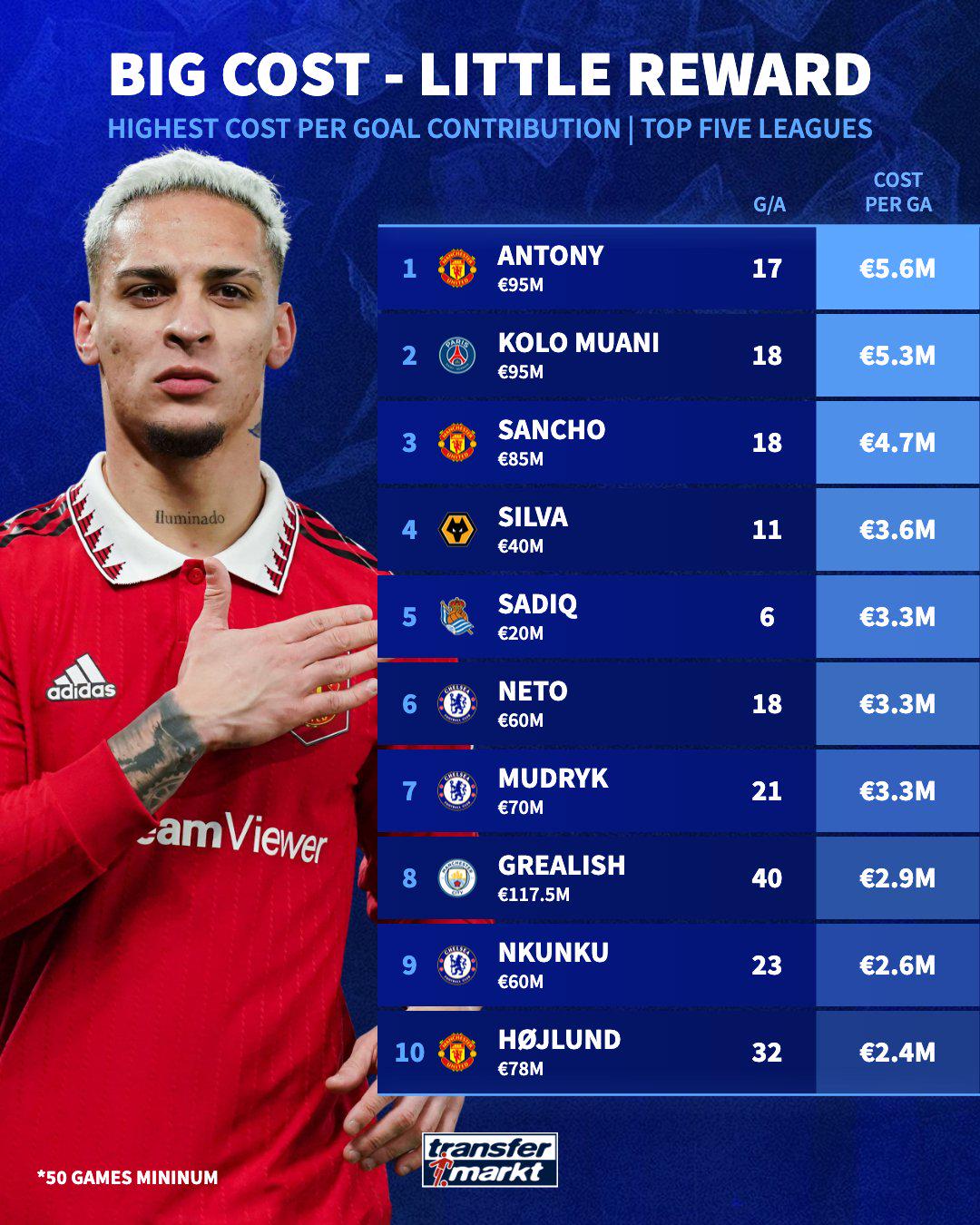 雷速体育8月8日讯 德国《转会市集》网站盘货了五大联赛中的10大高转会费加盟却为地方球队孝顺低效参与进球数(进球+助攻)的球员。
