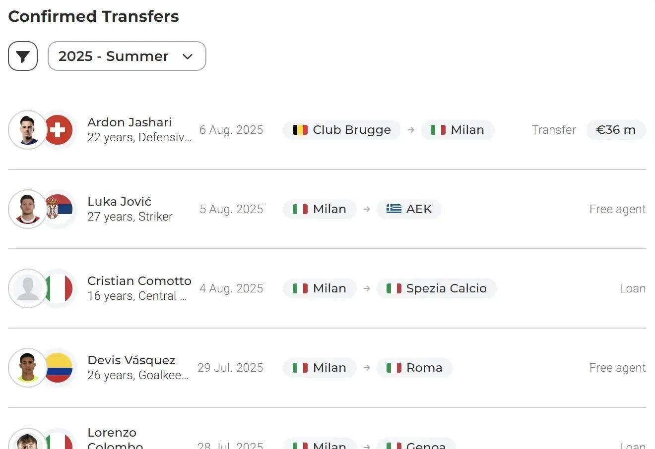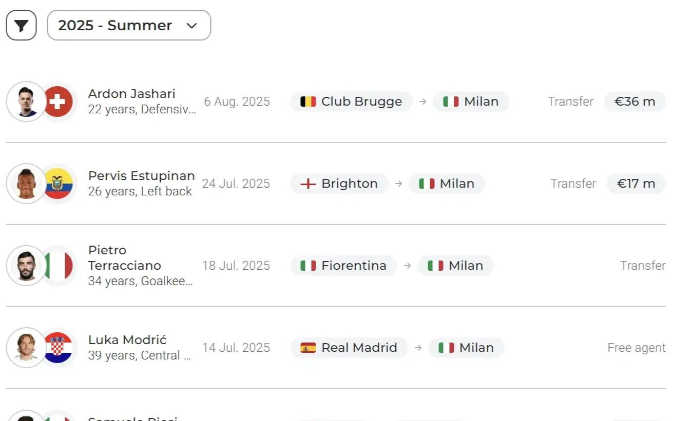 贾沙里 :这位23岁的防患/中场球员以3900万欧元从布鲁日转会而来,是米兰队史第9贵的引援。他拒却了其他俱乐部更优越的报价。这位瑞士球员一样从小即是米兰球迷,一张8岁的阿尔顿在圣西罗看台不雅看米兰对阵巴萨比赛的相片依然在流传,那恰是博阿滕打进惊世倒钩的经典之战。就场上特质而言,贾沙里是最接近成功替代赖因德斯的东谈主选。在初度新闻发布会上,阿莱格里文书他将使用三中场体系,筹议到福法纳、奇克、穆萨和邦多的存在,竞争将很热烈。