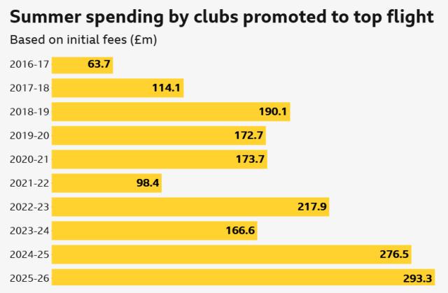 英超近10年升班马夏窗引援开销情况(完了2025年8月11日,单元:百万英镑)