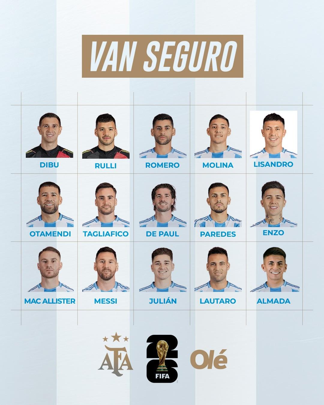 《奥莱报》以为,有15名球员如无不测将会铁定入选阿根廷国度队来岁宇宙杯的参赛名单,这15名球员永别是:门将达米安-和鲁利,后卫克里斯蒂安-罗梅罗、莫利纳、利桑德罗-马丁内斯、奥塔门迪、塔利亚菲科,中场德保罗、帕雷德斯、恩佐-费尔南德斯、麦卡利斯特,前卫梅西、胡利安-阿尔瓦雷斯、以及蒂亚戈-阿尔马达。