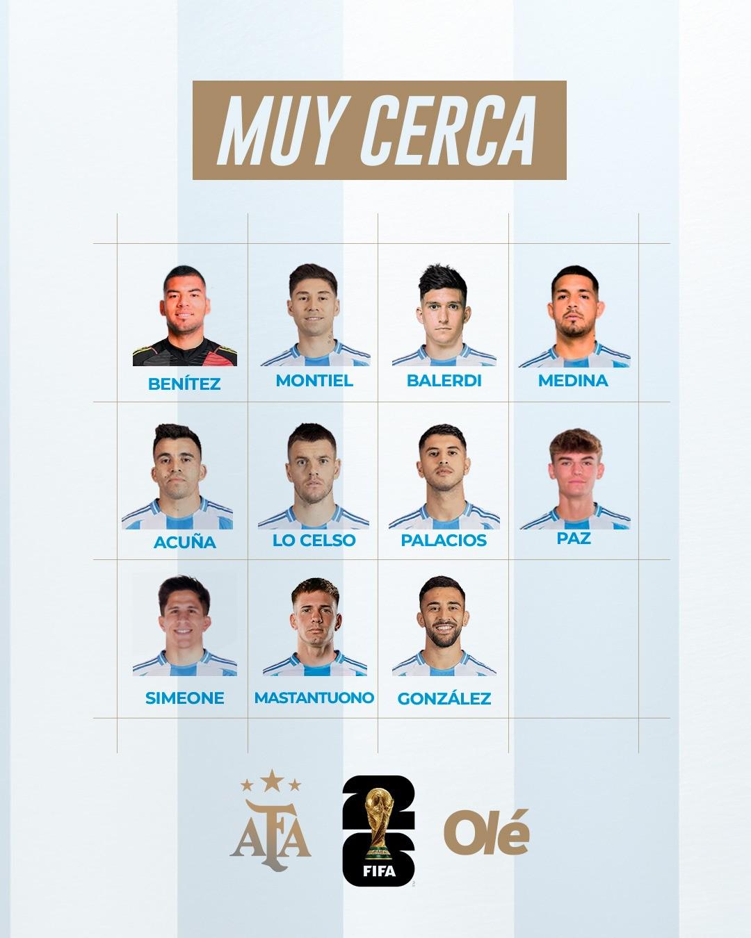 此外还有10名球员迥殊接近但仍需要进一步为我方进入宇宙杯的契机而战,他们永别是门将瓦尔特-贝尼特斯,后卫蒙铁尔、巴列尔迪、法昆多-梅迪纳、阿库尼亚,中场洛塞尔索、埃塞基耶尔-帕拉西奥斯、尼科-帕斯,前卫朱利亚诺-西蒙尼、马斯坦托诺以及尼古拉斯-冈萨雷斯。