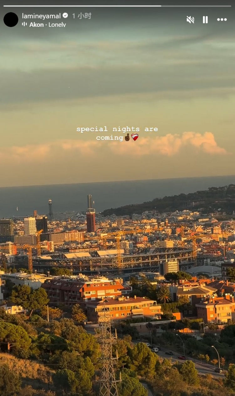 亚马尔社媒晒夕阳下的诺坎普球场:一个零星的夜晚行将到来