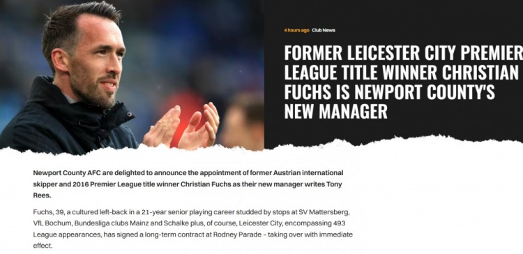 11月21日讯 纽波特郡官方布告,任命39岁的前莱斯特城英超冠军球员克里斯蒂安·富克斯为新任主造就。