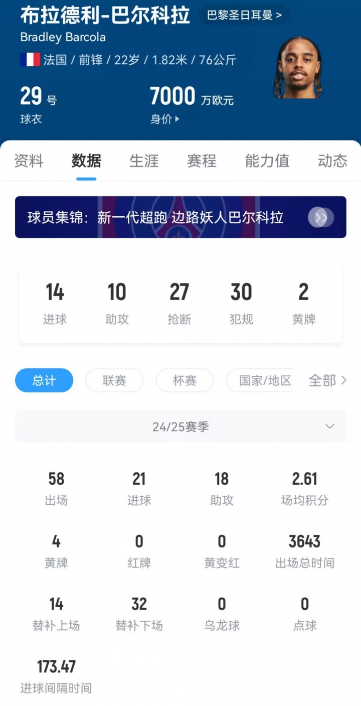 巴尔科拉上赛季随巴黎获取了多项冠军锦标,他当今的德回身价为7000万欧元。