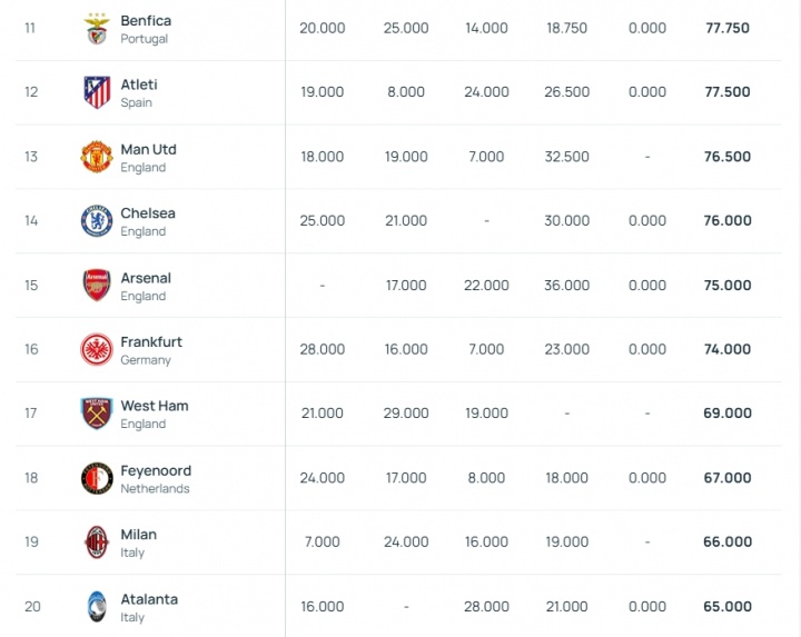 第11-第20:本菲卡、马竞、曼联、切尔西、阿森纳、法兰克福、西汉姆、费耶诺德、AC米兰、亚特兰大