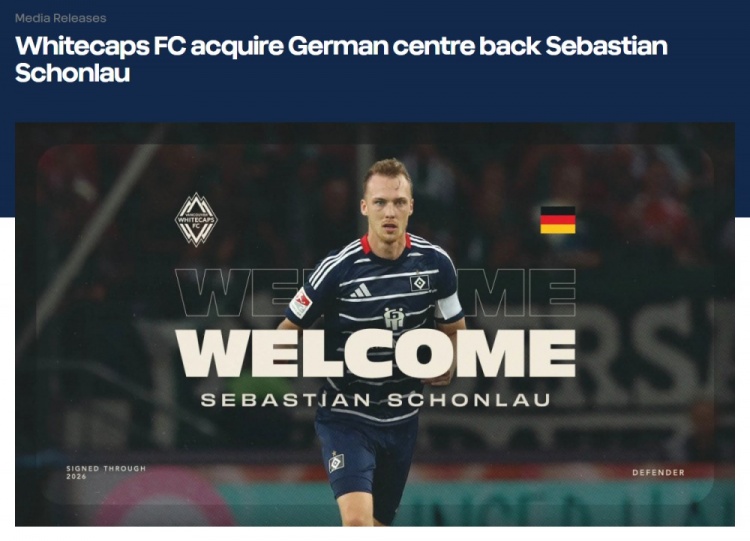 官方:温哥华白浪签下汉堡队长、31岁中卫舍恩劳,签1+1协议