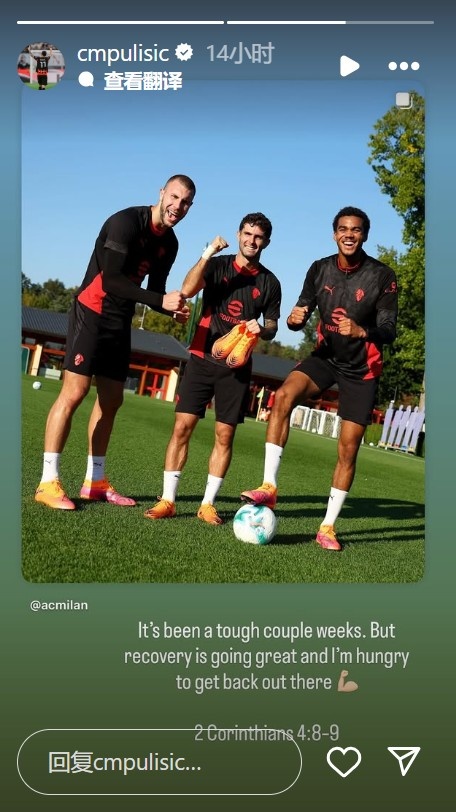 在本月的国外比赛日,米兰球员普利西奇在为好意思国队出战时受伤。昨天,米兰晒出普利西奇与帕夫洛维奇、奥多古的磨砺照,普利西奇转发并配文:这几周很浩繁,但我的归附发扬很好,渴慕重回赛场。