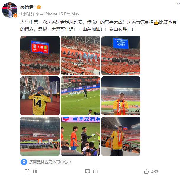 他发文:“东谈主生第一次不雅看足球比赛,传闻中的京鲁大战!现场歧视真棒,比赛也简直精彩,悠扬!大雷哥给力!!山东加油!!泰山必胜!!!”