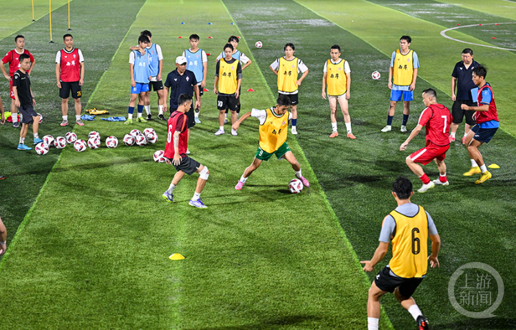 诚然空中飘着蒙蒙细雨,但老师组和队员们存眷不减,传球、跑位、抢断、射门……队员们按照老师条目,不休交叉换位、彼此呼喊着传切协作,55岁的主老师刘劲彪更是切身示范,致使倒地飞铲也绝不弄脏,展现了又名作事足球东说念主的专科教养和敬业精神,让这群大部分来自业余球队的小伙子们深深背叛,科学、新颖的老师相貌更是让大家胡作非为,球场上也时常传来掌声。