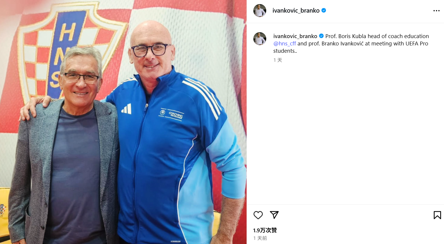伊万更新社媒,晒出与克罗地亚足协西宾利用合照