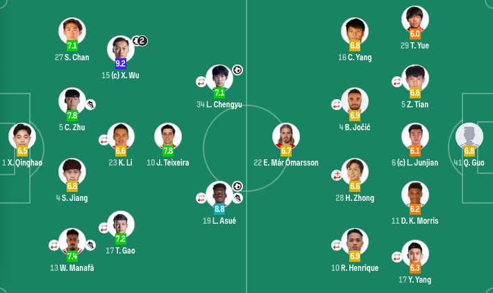 先锋:17-高天意(67'43-杨皓宇)、10-特谢拉(F)、34-刘诚宇(67'33-汪海健)