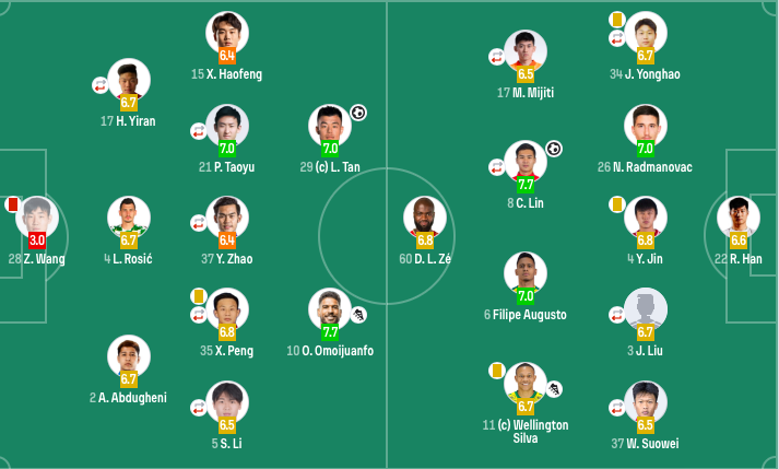 时尚:10-奥莫伊胡安弗(F)、29-谭龙、35-彭欣力(74'22-王禹)
